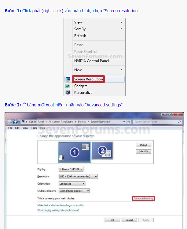 Bước 1: Click phải (right-click) vào màn hình, chọn "Screen resolution"