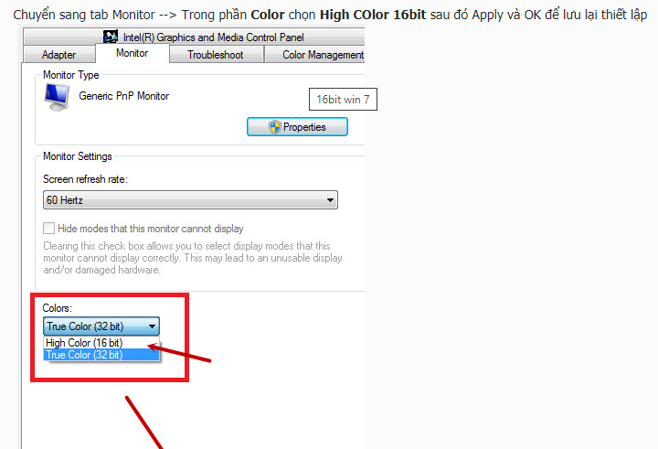Bước 3: Chuẩn sang tab Monitor và chọn 16bit ở mục Color như bên dưới