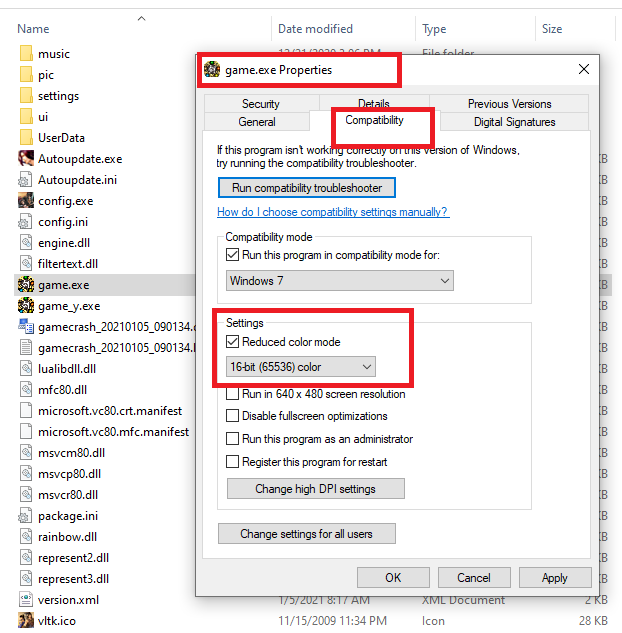 Bước 2: Trong cửa hiện ra, bạn chọn tab Compatibility và chọn 16bit như hướng dẫn trong hình dưới và nhấn OK